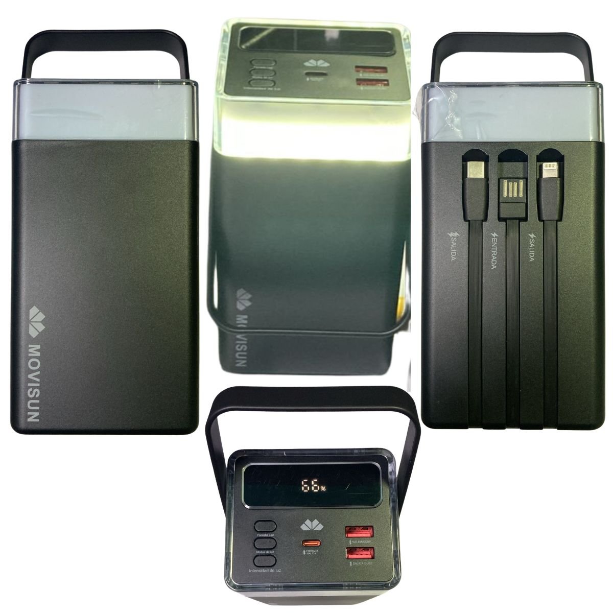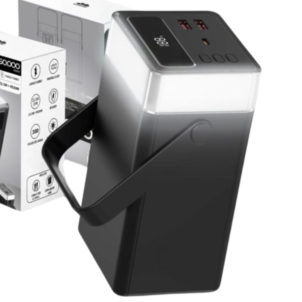 Características destacadas: Carga rápida PD y QC3.0 hasta 20W. Display digital con porcentaje de batería. Linterna LED con varios modos de luz.. Cables integrados (Tipo C, USB, Lightning). Compatible con celulares Android, iPhone, tablets, consolas y más.